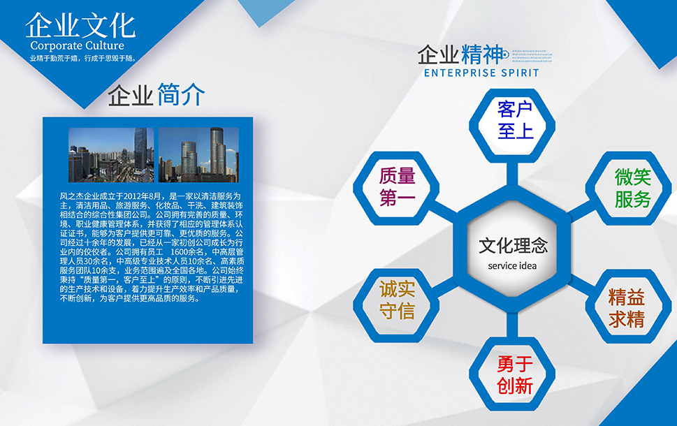公司于2012年8月成立,致力于將9年的線下管理經驗進行線上整合,復制推廣,力爭打造一個全國性的家庭服務平臺,并基于家庭服務的大數據,融合人工智能,整合服務資源,為家庭提供全方位,多保障的管家式服務,目前風之杰已與全國百余家企業簽署戰(zhàn)略合作,通過全體員工堅持不懈的努力,逐步布局全國,完善服務,提高品質,一切努力,只為盡我所能,凈你所想。